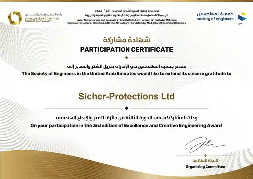 Sicher Protections Ltd is proud to be recognized by the Society of Engineers in the United Arab Emirates for our contribution to innovation and excellence in engineering. Our participation in the 3rd edition of the Excellence and Creative Engineering Award highlights our commitment to developing cutting-edge solutions that protect sensitive equipment in the most demanding environments.