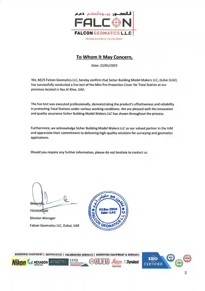 Falcon Geomatics LLC, a leading provider of surveying and geomatics solutions in the UAE, has officially confirmed the successful live test of our protection system for Total Stations. Conducted at their Ras Al Khor facility, the test demonstrated the product’s effectiveness and reliability in safeguarding equipment under various working conditions.